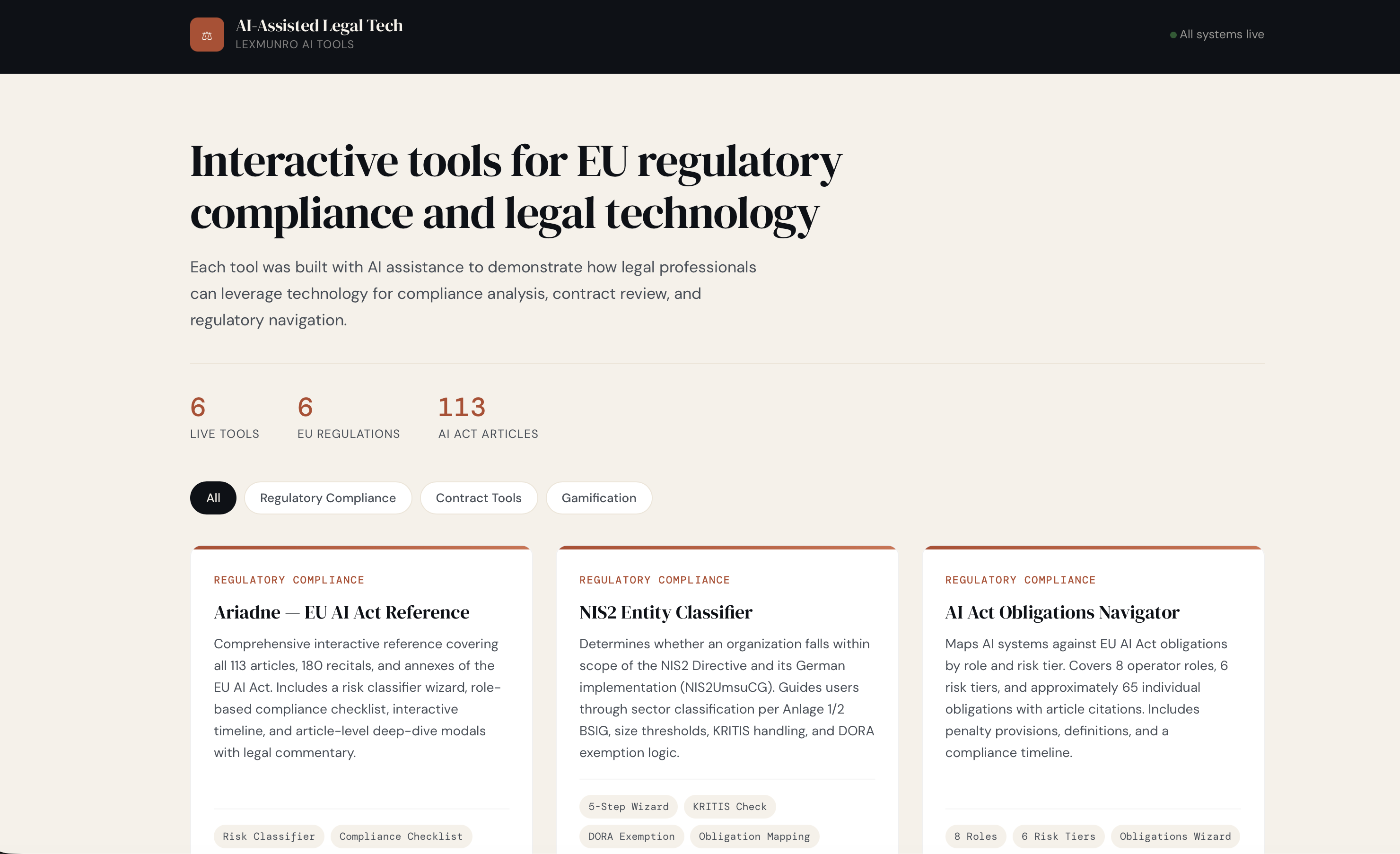 Interactive tools for EU regulatory compliance and legal technology - Each tool was built with AI assistance to demonstrate how legal professionals can leverage technology for compliance analysis, contract review, and regulatory navigation.