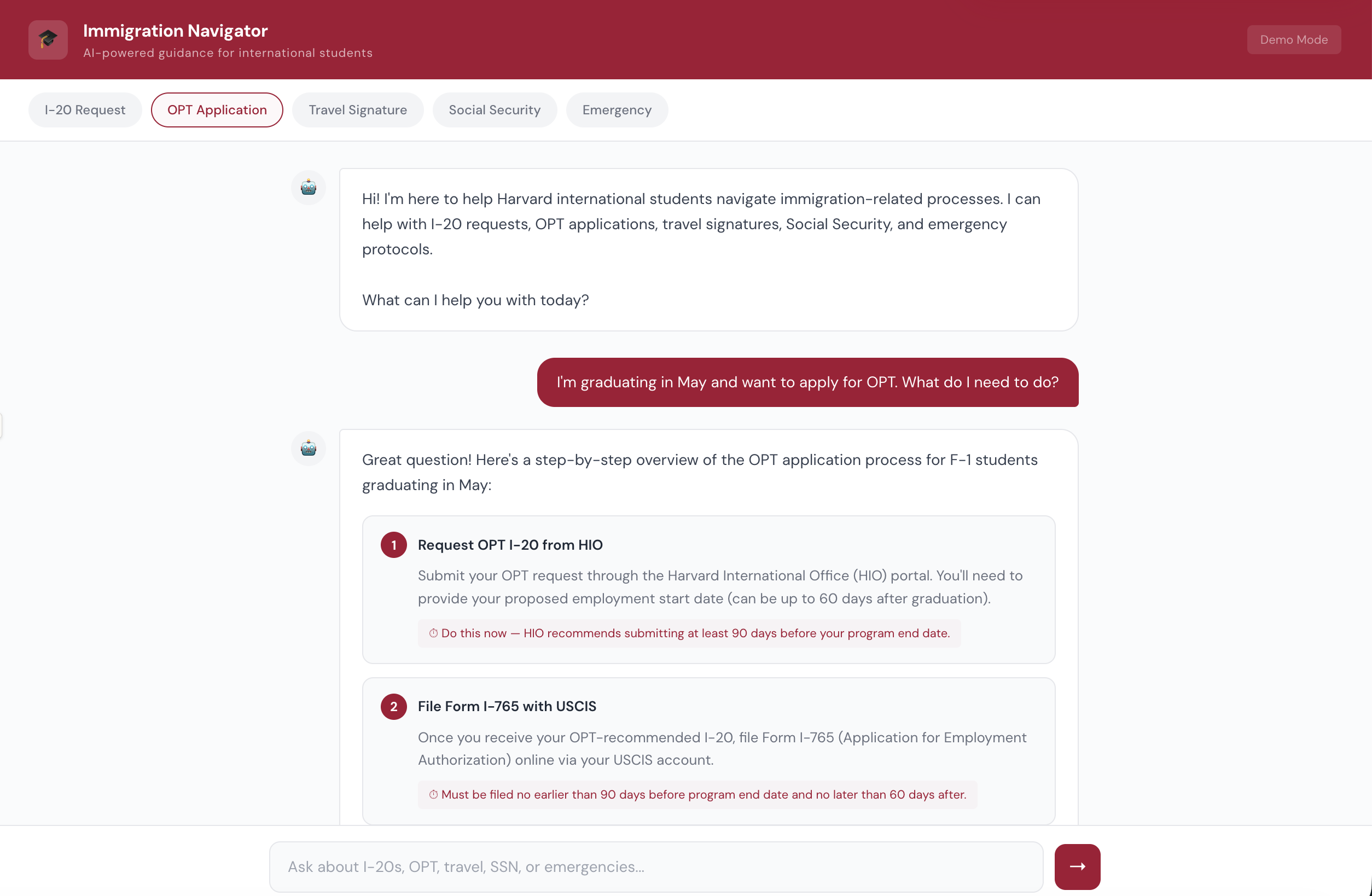 AI-powered legal information tool helping international students navigate visa processes, OPT applications, travel signatures, Social Security, and emergency protocols. Provides step-by-step guidance with source citations and appropriate disclaimers. Deployed on Hugging Face with privacy-conscious design — no personal data stored. Built with Python and Hugging Face Spaces.
